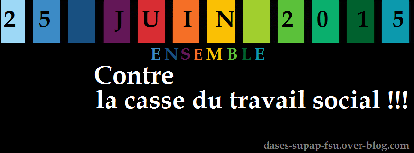Le 25 juin, le mot d'ordre est "ensemble contre la casse du travail social" : outre la réforme, il s'agit de nous mobiliser pour la reconnaissance de nos diplômes et contre la casse de la convention collective 66, le manque de moyens, les suppressions de postes... bref, la dégradation de nos conditions de travail et la perte de sens du travail social.