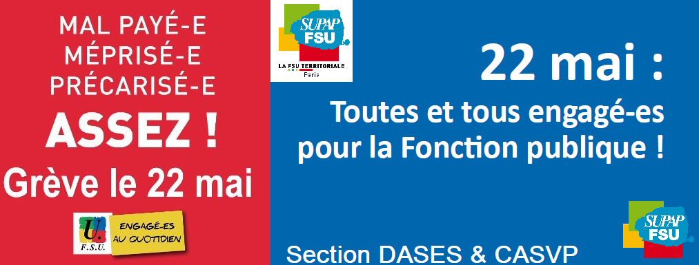 Avec les organisations CFDT, Cfe/Cgc, CFTC, CGT, Fa fp, FO et Solidaires, la F S U appelle à une nouvelle journée de grève et de manifestations le 22 mai prochain car la Fonction publique est aujourd’hui clairement menacée. Affaiblissement du dialogue...
